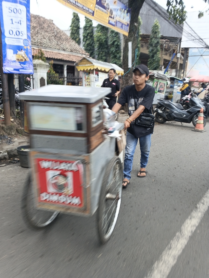 A man in a black t-shirt, jeans, and a cap walks beside a mobile food cart on a street. The cart has a square structure with a visible sign that says "WILLAYA DIMSUM" in red. Behind him, another man in a black uniform walks in the same direction. Parked motorcycles and other street vendors are visible in the background. A blue advertisement banner hangs on a pole to the left. The scene is set on an urban street with buildings and trees in the background.