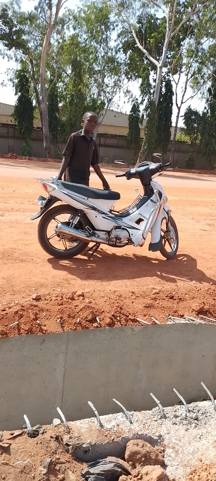 The image displays an outdoor scene in Television, Nigeria, under clear, bright daylight. A young male, wearing a dark short-sleeved collared shirt and dark trousers, stands on the left side of a white and black JINCHENG brand underbone motorcycle. His right hand is positioned near the motorcycle's rear luggage rack, and his left hand is near the seat. The motorcycle is stationary, supported by its side stand, on a reddish-brown dirt surface. In the foreground, a concrete foundation or low wall is visible, with multiple vertical rebar elements protruding from its upper edge. The ground around this concrete structure consists of loose, reddish-brown soil and small rocks. The background features several tall trees with green foliage and light-colored trunks, along with a darker band of vegetation and faint outlines of distant light-colored buildings. Shadows are cast by the motorcycle and the individual onto the ground.