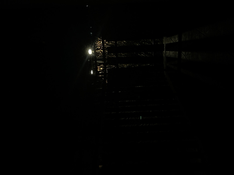 The image depicts a nighttime scene in Prevalje, Slovenia. A dark, vertical-barred fence or gate occupies the mid-ground, extending horizontally across the frame. Behind this structure, dense foliage is visible, brightly illuminated by artificial light sources, presenting a yellow-green glow. Above and behind the fence line, at least two bright, circular artificial lights, consistent with streetlights, are visible, casting light downwards. The ground in the immediate foreground is a dark, paved surface, reflecting some light and exhibiting distinct, elongated shadows cast by the vertical bars of the fence, extending towards the viewer. The upper portion of the image is entirely dark. No individuals or specific activities are discernible within the frame.