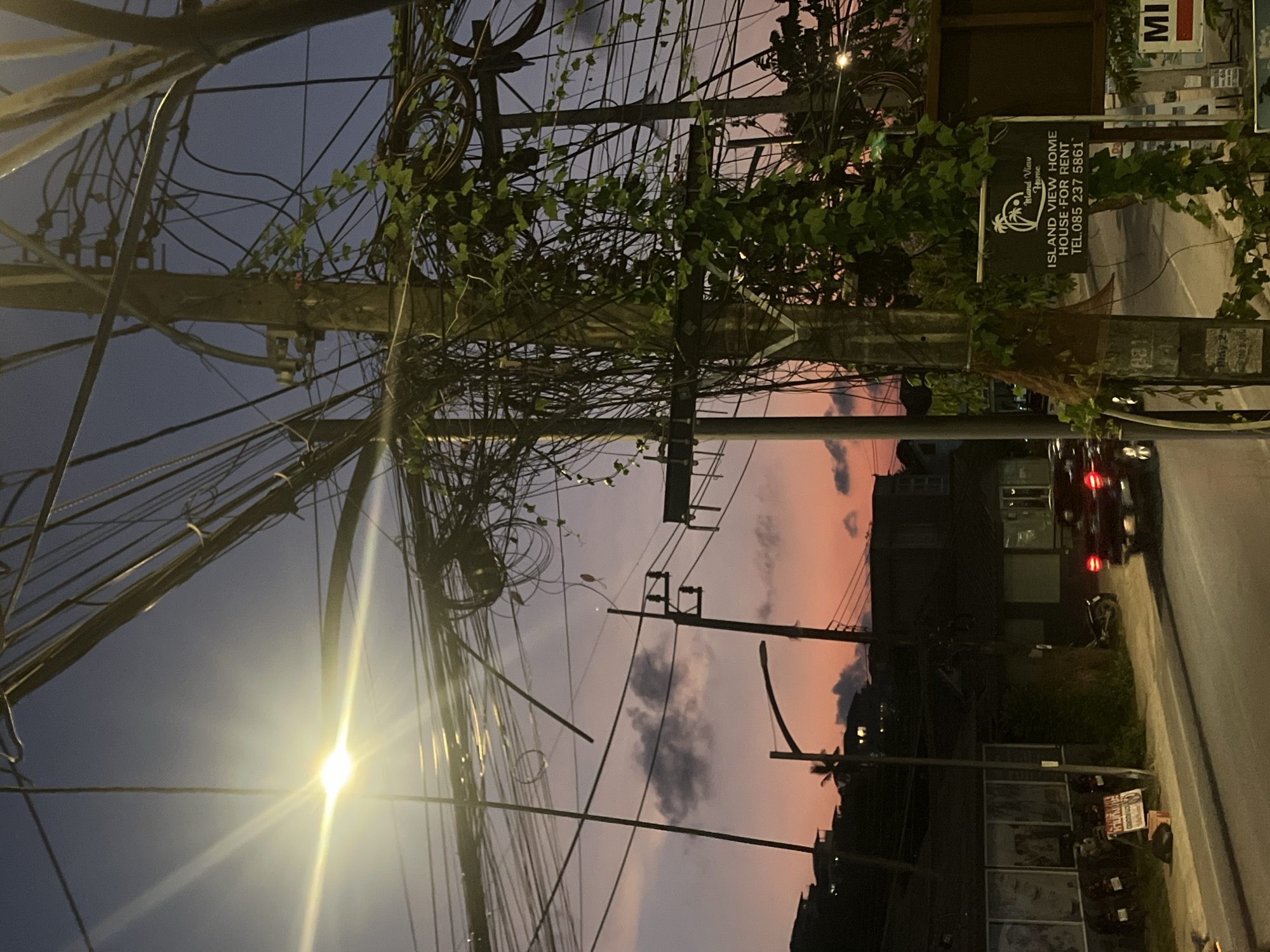 The image depicts a street scene in Baan Plai Laem, Thailand. A utility pole dominates the foreground, entangled with a dense network of wires. The sunset sky showcases a gradient of pink and purple hues. To the right, a sign reads "Island View Home, House For Rent". A building is visible, and a vehicle with its brake lights illuminated is parked or moving on the road. A street lamp shines brightly, casting light on the scene. A motorcycle is parked nearby, and posters are displayed. The image captures the urban landscape with a focus on the interplay of infrastructure and natural light during twilight.