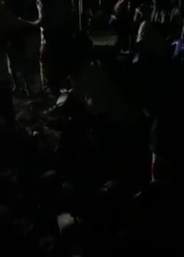 gathering of people at night, with only faint light illuminating the scene. The low lighting makes it difficult to discern details clearly. Some people are seen dancing or moving to the sound of drums. There are also tents or structures visible in the background. The atmosphere appears lively, with the drum beats and movements of people suggesting a social event or celebration.
