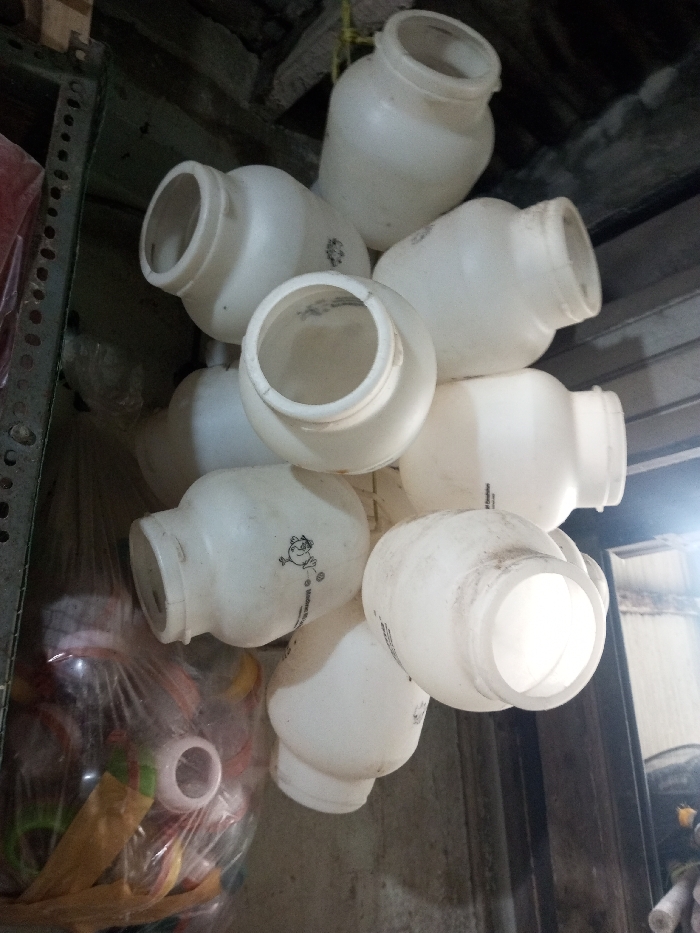 A cluster of white, cylindrical plastic containers is arranged haphazardly. The containers are open, their circular openings visible, stacked on top of each other. They are slightly dirty, possibly used. One container has a small cartoon frog image on it. The background shows shelving and assorted plastic items, some of which are wrapped in clear plastic. The lighting is uneven, casting shadows and creating bright spots within the scene.