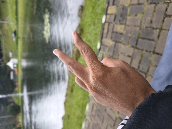 A hand makes a peace sign with its index and middle fingers. The hand is tan with visible veins and is set against a blurred background of a lake, green grass, and what appears to be a brick-paved area. In the far distance is a building on the bank of the lake. The hand is near the right of the frame with a black sleeve visible. The image is slightly tilted, making the background appear to slant.