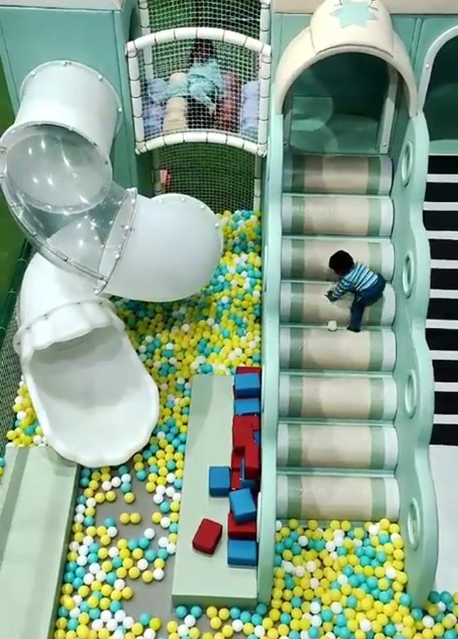 From an elevated, static position, the video presents an indoor playground. A child in a striped shirt ascends a light green staircase with rounded steps. Another child descends a white, transparent, spiral slide that deposits them into a ball pit filled with yellow, white, and blue balls. Red and blue soft blocks are scattered near the staircase. A netted play area is visible in the background, with people inside. The playground features light green and white structures with cartoonish designs. The overall environment is bright and colorful.