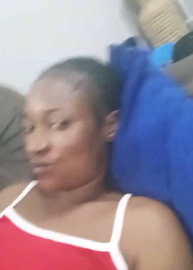 A woman lies on a gray couch with a blue pillow behind her head. She wears a red tank top with white straps. A dark-skinned person's arm is visible in front of her. The wall behind the couch is white with a brick pattern. A tall vase is visible on the wall. The woman is looking at the camera. She chews on her bottom lip and makes a face.