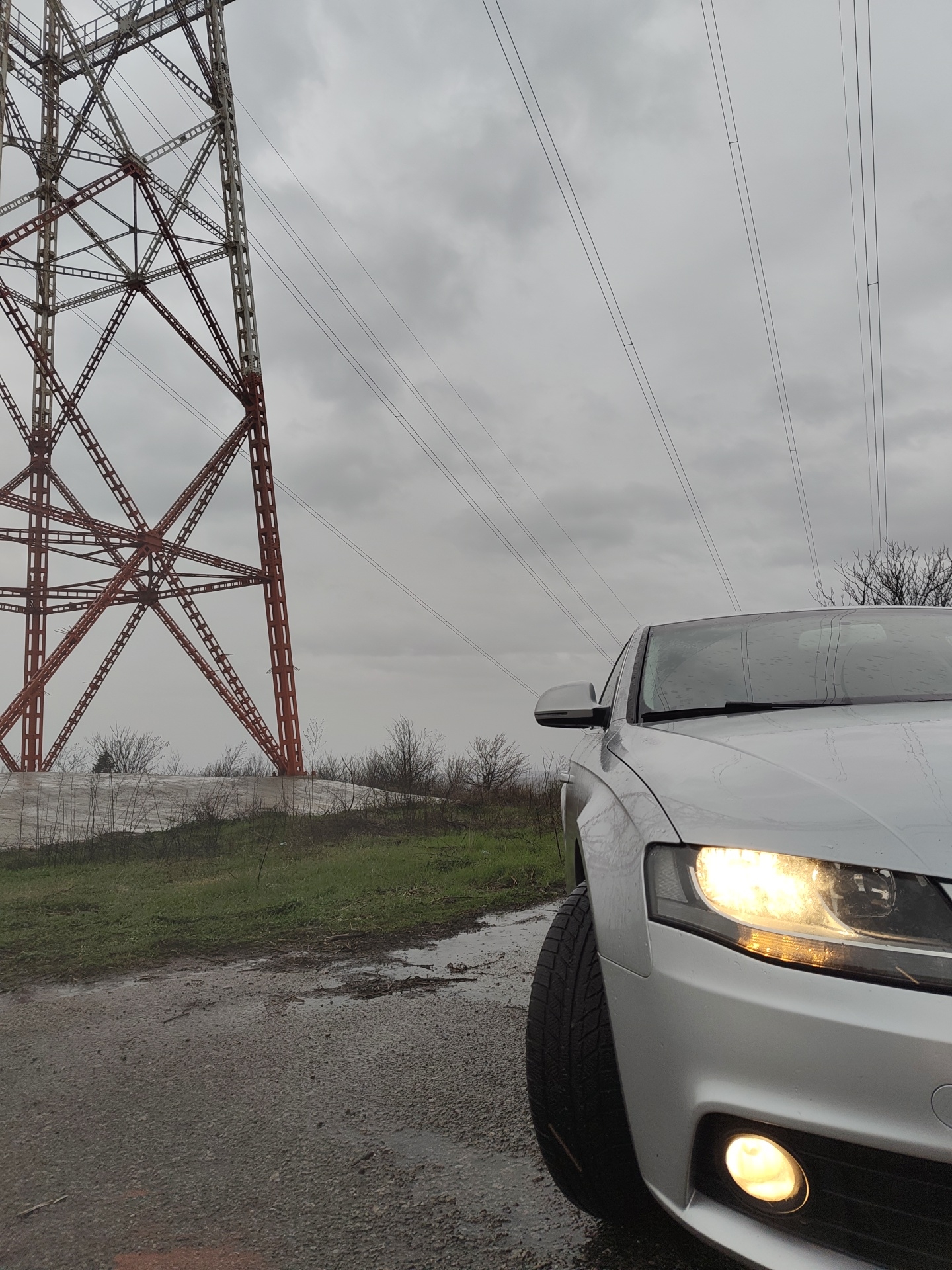 An outdoor scene in Kozloduy, Bulgaria, depicts the front right portion of a silver Audi sedan (Audi A4 B8) parked on a wet, gravelly surface. The vehicle's right main headlight and lower fog light are illuminated. Water droplets are present on its windshield and exterior surfaces. To the left and in the background, a large, reddish-brown and grey lattice-structured electrical transmission pylon ascends, supporting multiple power lines that stretch diagonally across a uniformly overcast, grey sky. The ground surrounding the pylon and in the mid-ground features green grass, dry shrubs, and small bare trees, with a light-colored, possibly concrete, mound at the pylon's base. Puddles are visible on the wet ground. No individuals are present in the image.