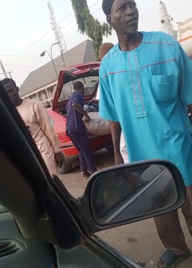 street scene with several individuals and vehicles. A red car with its trunk open is being loaded with what appears to be large bags. Several people are involved in this activity, while others stand nearby, watching. The camera is positioned inside a car, providing a view through the side mirror, reflecting a man in the mirror. The people visible are wearing casual clothes and traditional outfits. The environment includes a building with a minaret in the background, utility poles, and other vehicles on the road. The general impression is of a busy street with people engaged in transporting goods.