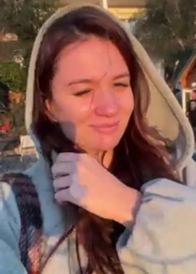 A woman with long brown hair and a grey hooded sweatshirt looks at the camera and smiles. She is wearing a backpack and standing outside near some buildings and trees. The sun is shining on her face. The background includes a building, trees, a wooden structure, and what appears to be a chair.