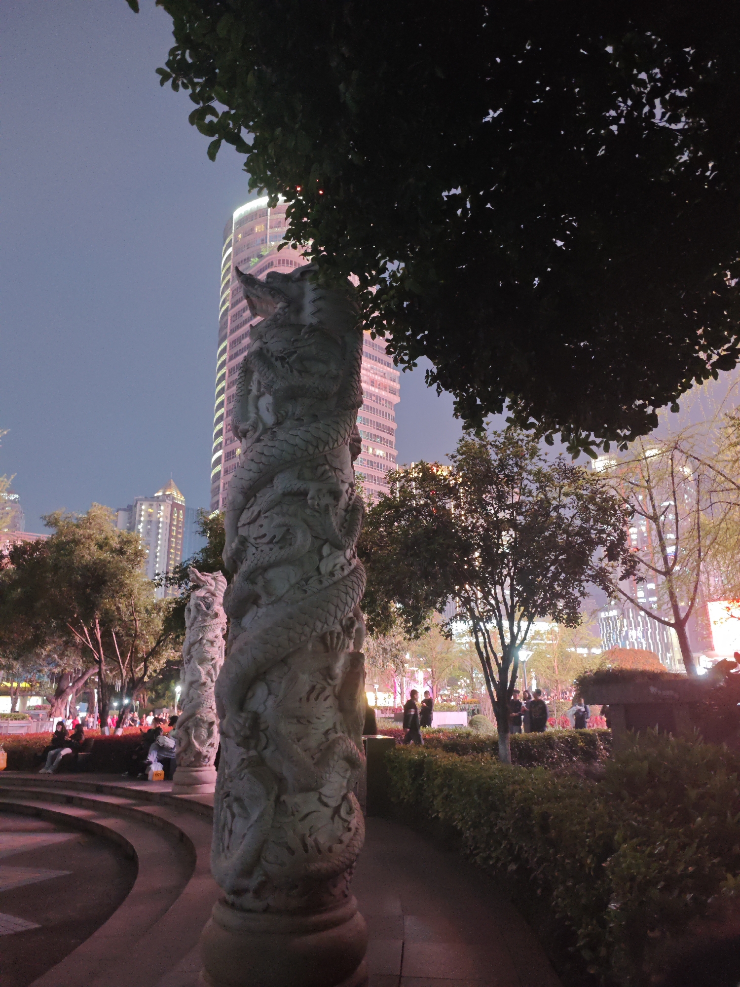 The image depicts a public park in Liangjiang, China, at dusk. A prominent feature is a series of ornate stone pillars carved with dragon motifs. Behind these, a modern skyscraper dominates the skyline, lit with vertical lines of light. Trees are scattered throughout the park, and their foliage obscures parts of the sky and buildings. Groups of people are observed in the park, some sitting on curved steps, others standing or walking along pathways lined with hedges. The overall atmosphere is urban and serene, highlighted by the combination of traditional sculptures and contemporary architecture.
