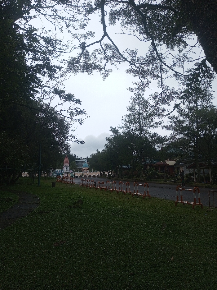 The image depicts an outdoor scene in Babaliya Mal., India, under an overcast sky. The foreground features a wide expanse of neatly trimmed green grass. A row of approximately ten orange and white striped portable barriers delineates the edge of the grass, separating it from a dark paved road. To the left, dense, dark foliage forms a boundary. In the midground, across the paved road, several structures are visible: to the left, a white building topped with an orange and white shikhara-style tower, suggestive of a temple. Adjacent to it, a light-colored building with a series of arches extends horizontally. Further right, a building with a light blue dome is partially visible. Trees with green foliage are scattered throughout the midground and background, framing the scene. A solitary individual, dressed in dark clothing, is walking away from the viewer on the right side of the paved road, near a building entrance. The background is dominated by a grey, cloudy sky and further tree lines. The overall lighting is soft and diffused.