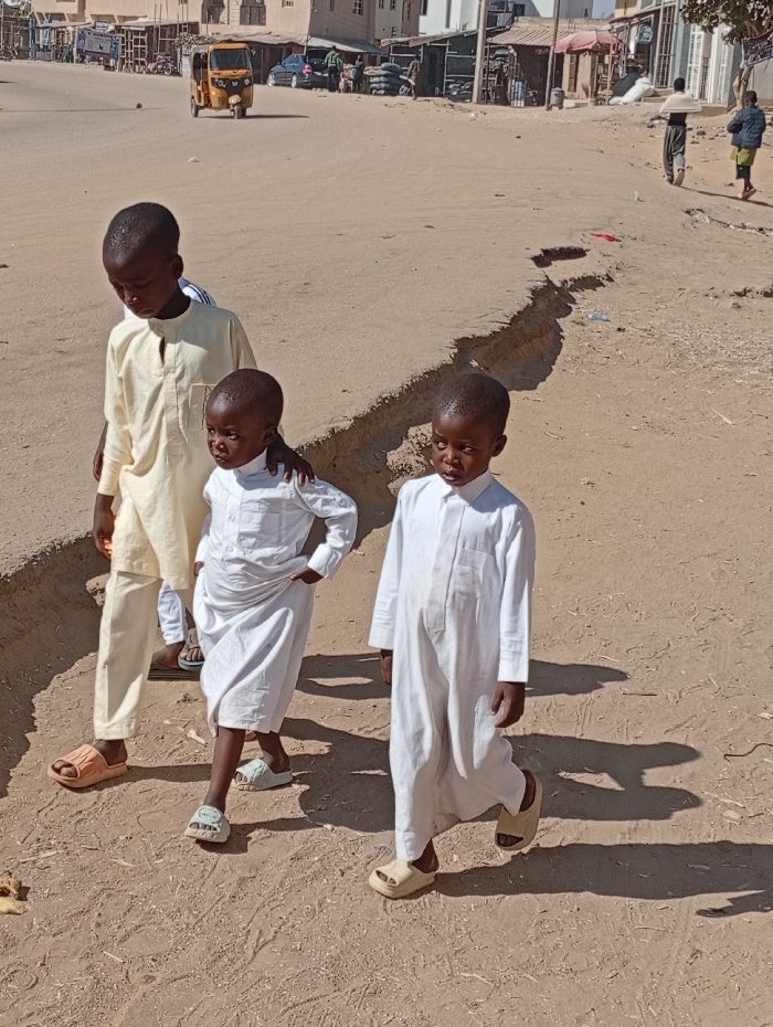 Three young boys walk together. The boy on the left wears a light yellow tunic and slide sandals. The boy in the center has on a white tunic and light-colored sandals. The boy on the right wears a white tunic and darker slide sandals. They are walking on a dirt and gravel path. In the background are buildings, a yellow auto rickshaw, and people walking. The scene appears to be a sunny day in a town or city.