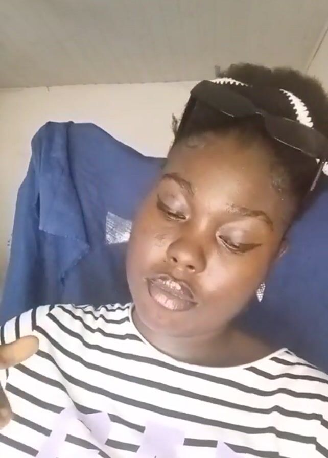 A woman with dark skin is looking into the camera in what appears to be an indoor setting. She is wearing a striped shirt with a word in purple that is partially visible, a pair of dark sunglasses resting on her head, and small dangling earrings. Her hair is pulled up in a bun. She is sitting or standing in front of a blue blanket. A white ceiling with a lightbulb can be seen above. Music is playing in the background as she looks at the camera and talks.