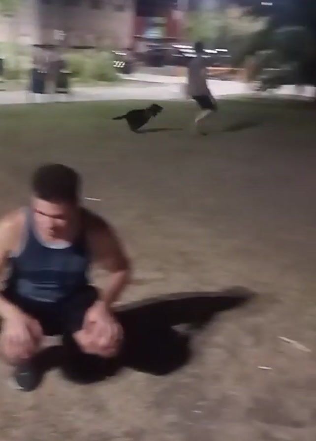 park at night. In the foreground, a man in a tank top and shorts is crouching. A dog is running around on the grass behind him, and another man is running after the dog. There are other people in the background, and streetlights illuminate the park.