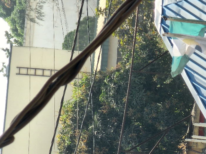 The image captures an outdoor scene in Jos, Nigeria, characterized by urban infrastructure and vegetation under bright daylight. A thick, dark, insulated electrical cable crosses diagonally through the upper foreground, with several thinner utility lines running horizontally below it. The midground features dense green foliage, likely from trees, with small clusters resembling blossoms or nascent fruit. A rusted, dark metal railing horizontally traverses above this vegetation. Below the foliage on the right, a section of a blue corrugated metal roof is visible, supporting two small flags on poles: one with green and white horizontal stripes, and another solid green, both appearing to flutter. In the background, a cream-colored building with a flat roof stands prominent, featuring a dark, fixed metal ladder mounted vertically on its exterior. Adjacent to this structure on the right, a white wall or building section is partially visible, backed by additional green foliage. No people or animals are present in the frame.