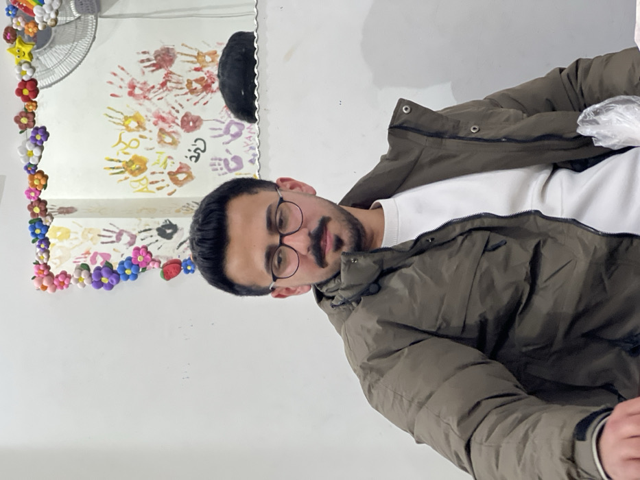 A male individual is depicted seated indoors in Al-Qanawat Municipality, Syria
