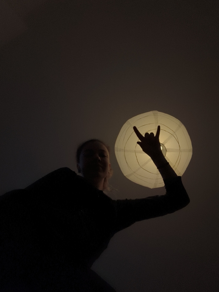A low-angle interior photograph shows one individual beneath a suspended, illuminated paper lantern ceiling lamp. The subject, largely silhouetted, displays light-colored hair and is partially backlit. Their left arm extends upward, with the hand performing the "rock on" gesture directly in front of the glowing, spherical white lamp. The lamp emits warm yellow light, serving as the primary light source. The individual wears a dark, long-sleeved top. The background is a dark, plain ceiling, indicating an indoor room in the city of Unknown, Unknown.