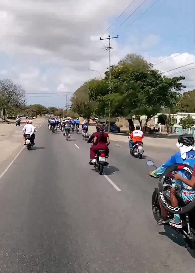 A group of cyclists is traveling down a two-lane paved road, followed by several motorcycles. The cyclists are wearing helmets and cycling gear. The motorcycles are carrying passengers, some of whom are holding bicycle tires. The road is bordered by trees and vegetation on both sides. There are power lines overhead, and a few buildings visible in the distance. The sky is partly cloudy. The camera is positioned behind the cyclists, recording from a vehicle following the group.
