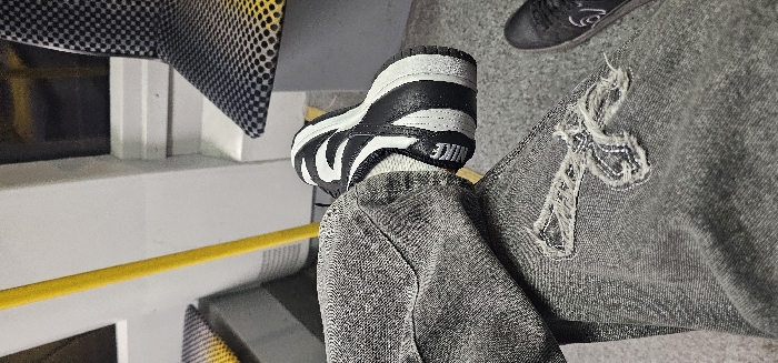 A person is wearing gray distressed jeans and black and white Nike sneakers. The left sneaker is visible with the Nike logo in white. The jeans have a ripped cross design on the right thigh. Another dark sneaker is partially visible at the top right corner. The background is a mix of interior elements with a yellow rail. The photo is rotated counterclockwise.