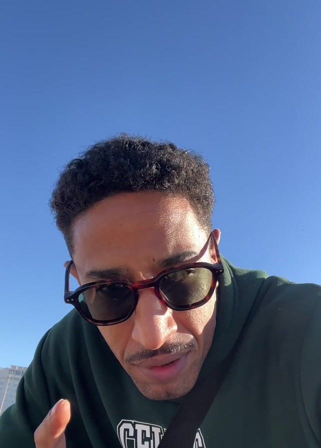 man wearing sunglasses and a green hooded sweatshirt, standing outside on a sunny day with a clear blue sky in the background. He is talking and gesturing with his hands towards the camera. He appears to be enjoying himself, smiling and looking directly at the camera. The environment seems to be a beach or outdoor area, with possibly buildings visible in the distance.