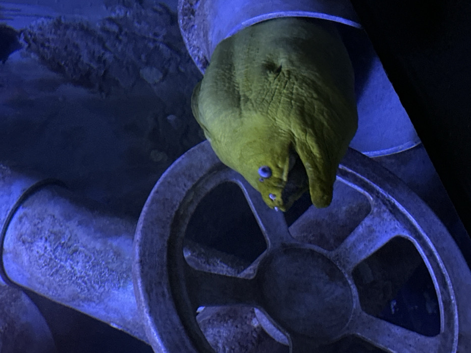 - "A green moray eel peers from within industrial pipes in an aquarium" by FM-2Bjlr1, licensed under CC BY 4.0