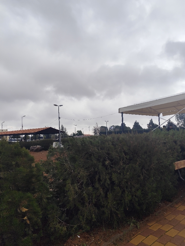 The image displays an outdoor scene in Jibb as-Safa, Syria, under a uniformly overcast, grey sky. The lower half and center of the frame are occupied by dense, dark green shrubbery. To the immediate right, a section of paved walkway constructed from alternating light brown and dark brown rectangular pavers is visible. A wooden bench is partially obscured by foliage on the far right. Beyond the foreground vegetation, an expanse of reddish-brown earth contains a prominent, irregular light-colored rock. Several tall, dark lampposts with dual light fixtures are spaced across the midground. On the left, a long, open-sided structure with a reddish-brown tiled roof and dark support pillars provides shelter, with vehicles (possibly buses or vans) partially visible beneath it. On the right, a large, rectangular white canopy is supported by dark columns. A faint horizontal line of small, dark objects is strung between several lampposts in the upper midground. Additional trees and obscured structures are present in the distant background. No individuals are discernible within the frame.