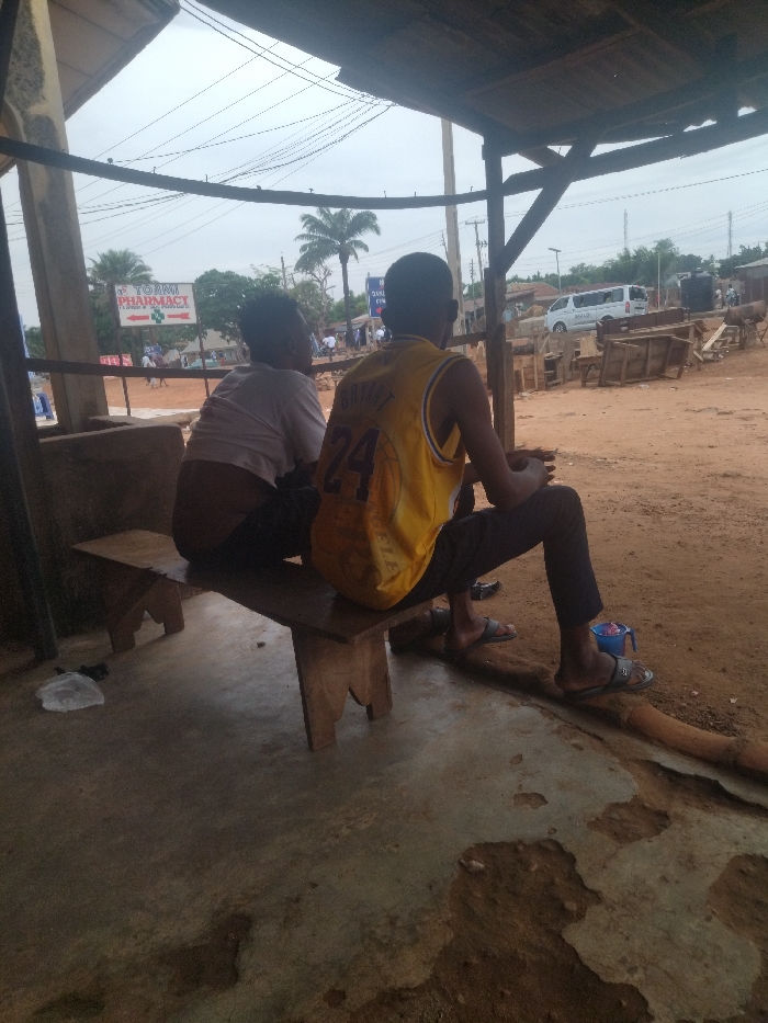two young men sitting on a wooden bench, facing forward, with their backs to the camera. The bench is in front of a wooden structure with a roof and a wooden post. The men are located on a dirt path in a town, at a location in Asuir, Nigeria that corresponds to the coordinates provided. The man on the left is wearing a white shirt and the man on the right is wearing a yellow tank top with "24" on the front. The man on the right is wearing black pants and has a pair of sandals on his feet. The man on the left has on a pair of black shoes and has his legs crossed at the ankles. The background shows other people in the distance. The sky is grey and overcast. The ground is dirt, with some paved areas. There is a sign in the background, reading "TOMMY PHARMACY". A plastic bag lies on the ground near the bench. A small blue cup is on the ground near the man on the right. A wooden post in the ground is at the right edge of the image.