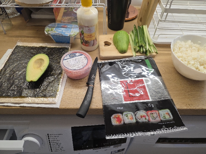 - "The scene is set in a kitchen in Byala Slatina, Bulgaria, displaying ingredients and tools arranged on a light-colored wooden countertop for sushi preparation" by FM-rp3GD2, licensed under CC BY 4.0