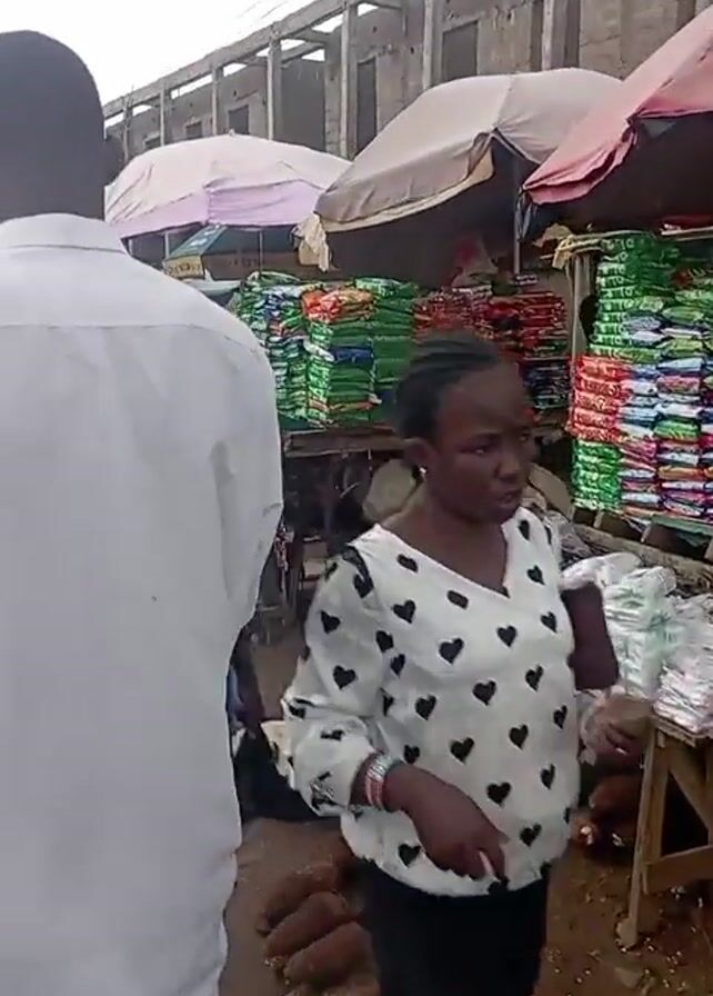 The video depicts a bustling market scene in an outdoor setting. The ground appears to be dirt or mud, and the sky is overcast. Several stalls are visible, displaying a variety of goods, including what appears to be bags of food items stacked in colorful piles. Other vendors are selling goods from tables. People are walking around the market, some are on foot, while others are riding motorcycles or bicycles. One person is wearing a white shirt, while others are wearing various casual clothing. The overall atmosphere suggests a busy marketplace in a possibly rural or less developed area.