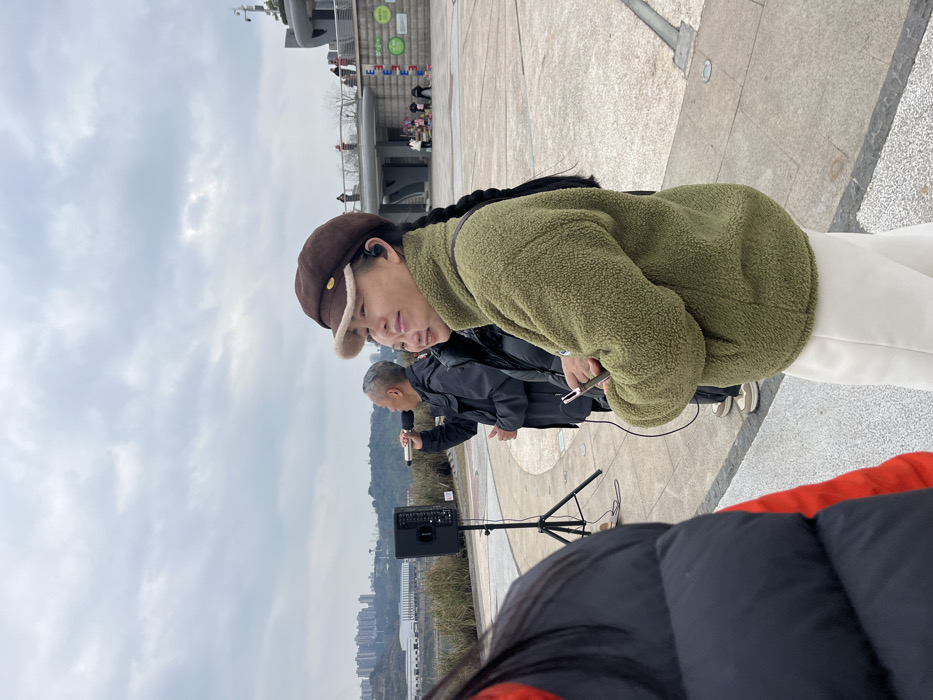 An outdoor scene in Banan, China, is captured under an overcast sky on a paved public area. In the mid-foreground, a woman in a brown flat cap, olive-green fleece jacket, and light-colored pants stands in profile, looking right with a slight smile. She wears a dark earbud in her left ear and holds a smartphone with a wired accessory. Behind her, another woman is partially visible, also smiling. Further back, a man with grey hair holds a silver microphone to his mouth, appearing to speak or sing, positioned near a black portable speaker on a tripod. To the far left, a person wearing a black and red puffer jacket is partially visible. The paved area borders a strip of dry reeds, beyond which lies a body of water. Across the water, a cityscape with numerous high-rise buildings extends up a distant hillside. To the right, a multi-level concrete structure with railings and various signs hosts several individuals on its elevated platforms.