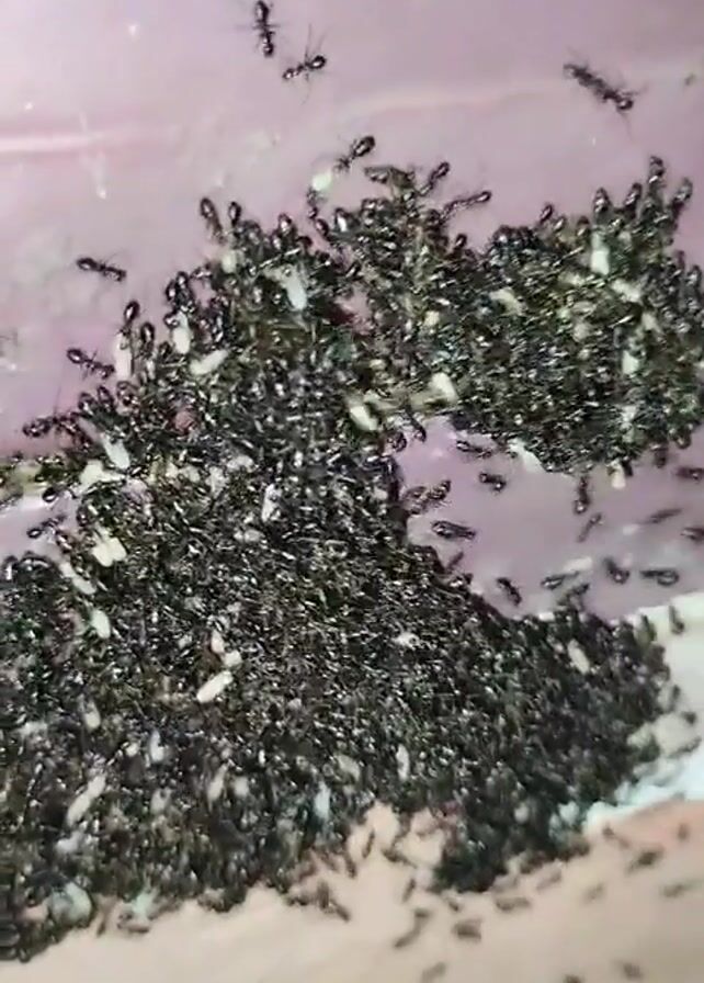 large colony of black ants swarming on a pale pink surface. Mixed in with the ants are small, white, oval-shaped objects, potentially larvae or eggs. The ants are tightly packed together, covering a significant portion of the surface, and are actively moving. The video appears to be a close-up shot.
