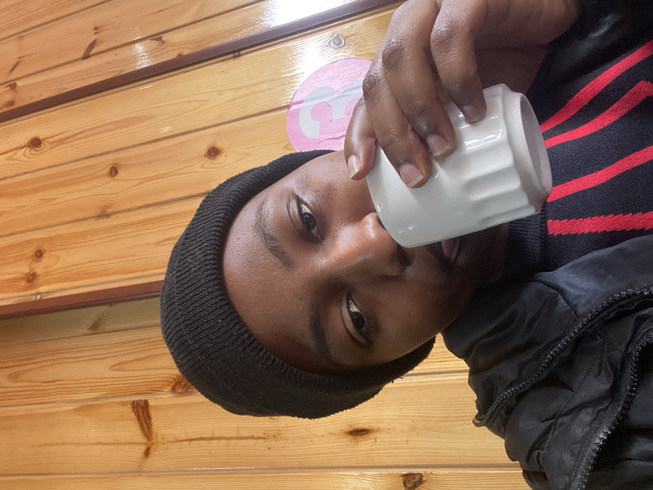 A person with dark skin and dark eyes, wearing a black beanie and a black jacket, is drinking from a white ceramic cup. The background is a light brown wooden wall with a pink sticker. The person is also wearing a black sweater with red stripes. The image is slightly rotated.