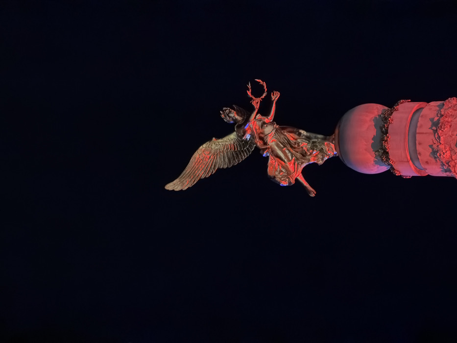 Against a dark blue background, a golden statue of an angel stands atop a column. The angel holds a laurel wreath aloft. The angel and column are illuminated with red and blue lighting. The column has a bulbous top. The statue is positioned on the right side of the frame with the wing outstretched to the left.