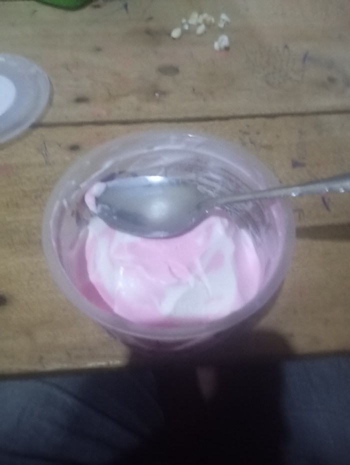 - "A clear plastic cup containing a partially melted pink and white substance, consistent with ice cream or yogurt, is centered on a light brown wooden surface" by FM-aYX0B3, licensed under CC BY 4.0