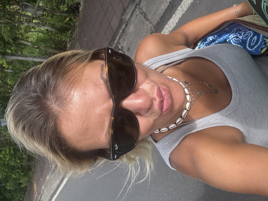 A sun-drenched selfie captures a fair-skinned woman with blonde-highlighted hair