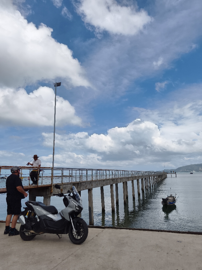 A gray scooter is parked near a concrete pier. Two men are standing near the scooter, while another man is standing further down the pier. A small boat is visible in the water. The pier stretches out into the sea, supported by concrete pillars. The sky is blue with white clouds.