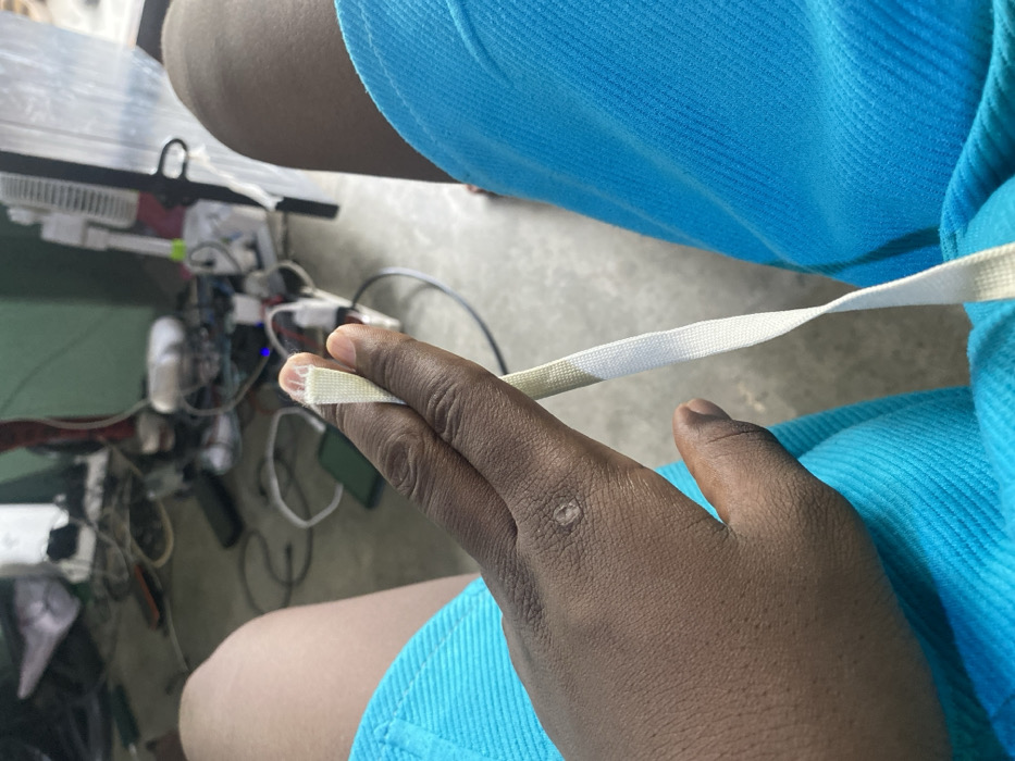 The image presents a high-angle, first-person perspective of an individual seated in an indoor setting in Agege, Nigeria. The foreground is dominated by the person's upper thighs, clad in bright blue, ribbed-textured shorts. A dark-skinned right hand occupies the center, holding a narrow, white fabric strip, approximately 1 cm in width, between the index and middle fingers. The tip of the held fabric strip appears slightly frayed. A small, raised, circular lesion or scar is visible on the dorsal surface of the hand, positioned between the knuckles of the index and middle fingers. The background is out of focus, revealing a light-colored floor and a wall, partially painted a muted green. This area is heavily cluttered with an array of electronic devices, including tangled black and white cables, power adapters, power strips, and at least one dark-colored smartphone lying on the floor. A white stand fan is partially visible on the right side of the background.
