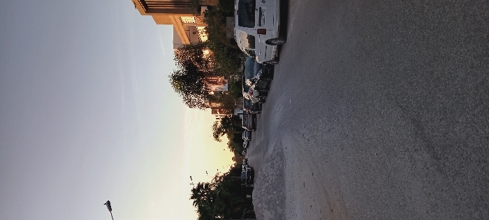 The image displays an urban street in Fez, Morocco, captured during either sunrise or sunset, evidenced by the low, warm light source on the left horizon, casting an orange-yellow glow. The asphalt roadway, devoid of visible lane markings, stretches into the background. A large pile of light-colored aggregate material (e.g., sand or gravel) is situated on the left side of the foreground. Numerous vehicles are parked parallel to the curb on both sides of the street. In the right foreground, a white panel van, resembling a Volkswagen Caddy, is parked, followed by a series of dark-colored passenger cars extending further down the street. The left side of the street is bordered by dense green foliage, including palm trees, and multiple streetlights. On the right, multi-story modern buildings with light brown/orange facades and dark-framed windows are visible, partially illuminated by the ambient light. No human figures or active interactions are present within the frame. The sky transitions from a bright, warm orange-yellow near the horizon to a clear, pale blue overhead.
