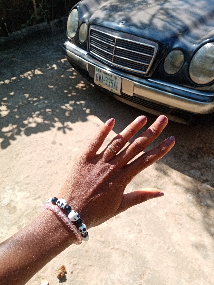 The image depicts a human left hand extended forward in bright daylight, positioned over a light-colored paved surface, likely concrete. The hand has a darker skin tone, and its fingernails are painted a muted pink/mauve color. A thin, silver-colored double-banded ring adorns the fourth (ring) finger. Two elastic bracelets are worn on the wrist: one features white skull-shaped beads interspersed with black spherical beads, and the other consists of smaller, translucent pink spherical beads. In the background, the front section of a dark-colored Mercedes-Benz sedan is visible. Key features include a chrome grille with horizontal slats, dual circular headlights on each side, and a chrome bumper trim. A Nigerian license plate, white with green characters, is affixed to the front of the vehicle, displaying "ABUJA" at the top and "GWA-335AL" below. The environment is outdoors, characterized by strong sunlight casting distinct shadows of tree foliage on the ground. The scene is located in the city of Rido, Nigeria, featuring a vehicle registered in Abuja, Nigeria.