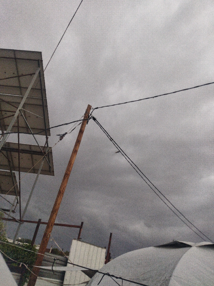 The image captures an outdoor scene in Khan Yunis, Palestinian Territory, under an overcast sky. On the left, a multi-panel solar array is mounted on a metal framework, angled upwards. A reddish-brown wooden utility pole stands towards the center, supporting multiple black electrical or communication wires. One wire extends diagonally across the top of the frame. Two parallel wires run diagonally downwards from the pole towards the right. A small, dark, elongated piece of debris is suspended from one of the lower wires connected to the pole. Below the pole and towards the right, partial views of white corrugated metal structures and dark structural elements are visible. In the lower right foreground, a portion of a large, light-colored, textured domed structure is present. Green foliage is minimally visible on the far left. No individuals are present.
