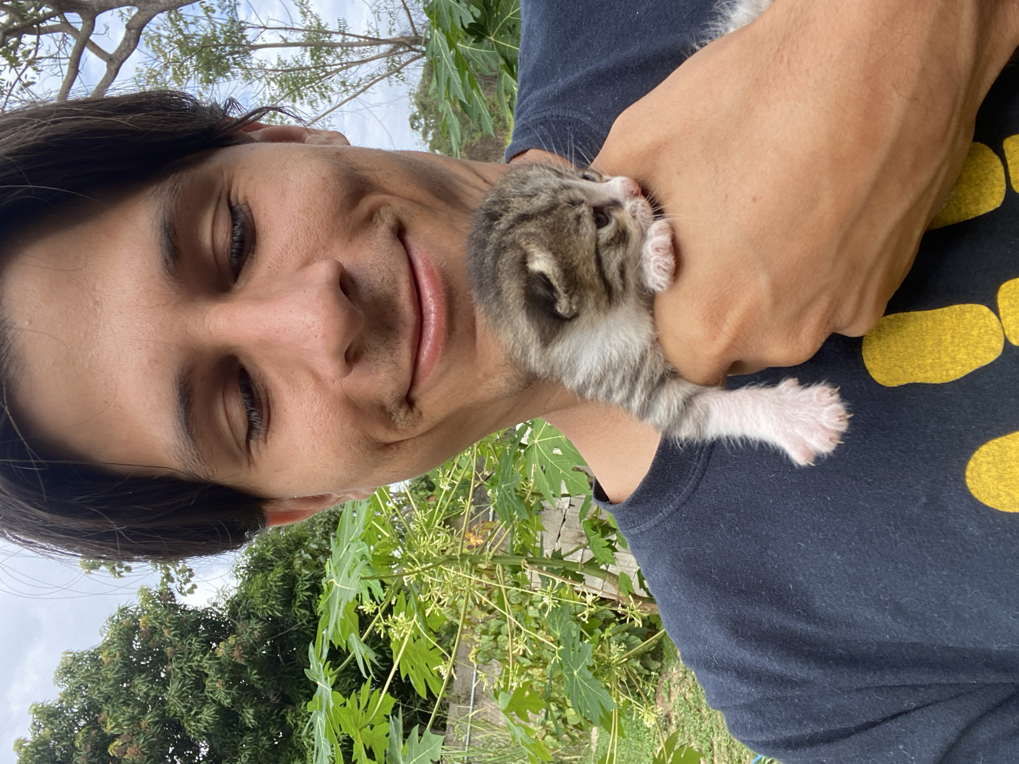 A medium-shot selfie shows a person holding a kitten outdoors