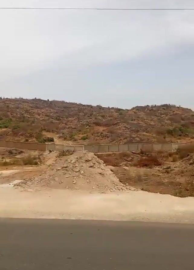 road-side view from a moving vehicle. The environment is dry and features rocky hills in the background. A partially constructed wall can be seen along with some scattered vegetation. As the vehicle moves, buildings appear on the right side of the road, including a water tank on a raised platform and a structure with the signage "SAHAR GAS". People are visible near the SAHAR GAS building. The sky is overcast. Power lines are visible overhead.
