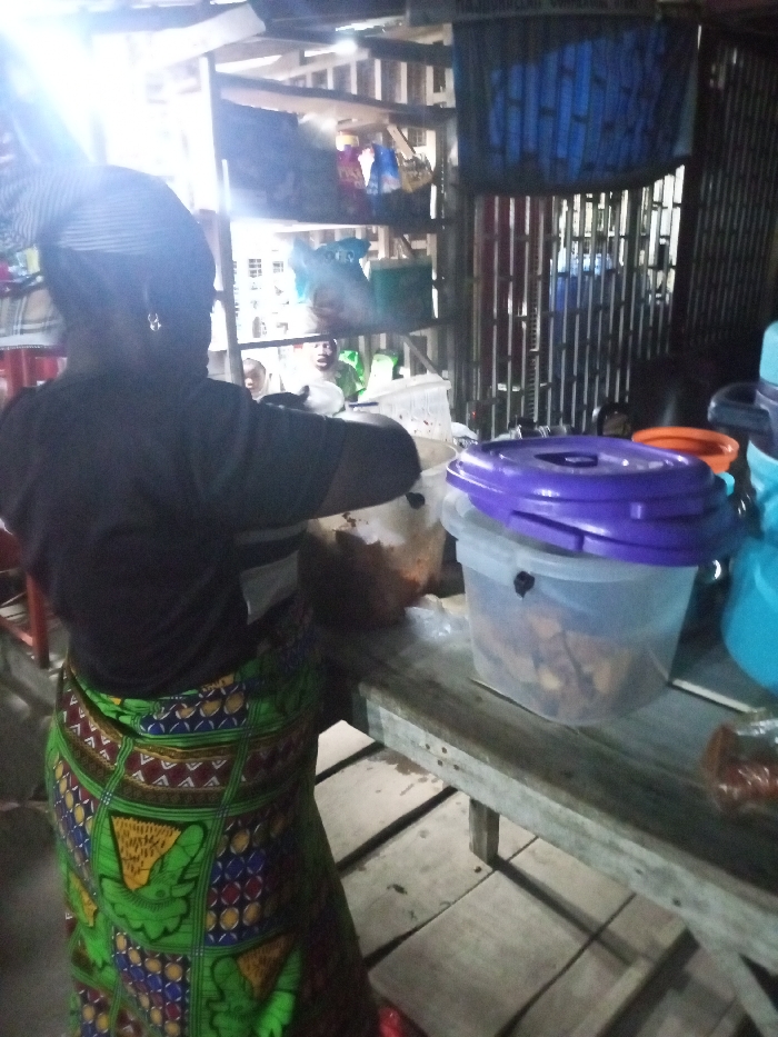 The image portrays an interior scene, likely a food stall or small shop, located in Ogbomosho, Nigeria