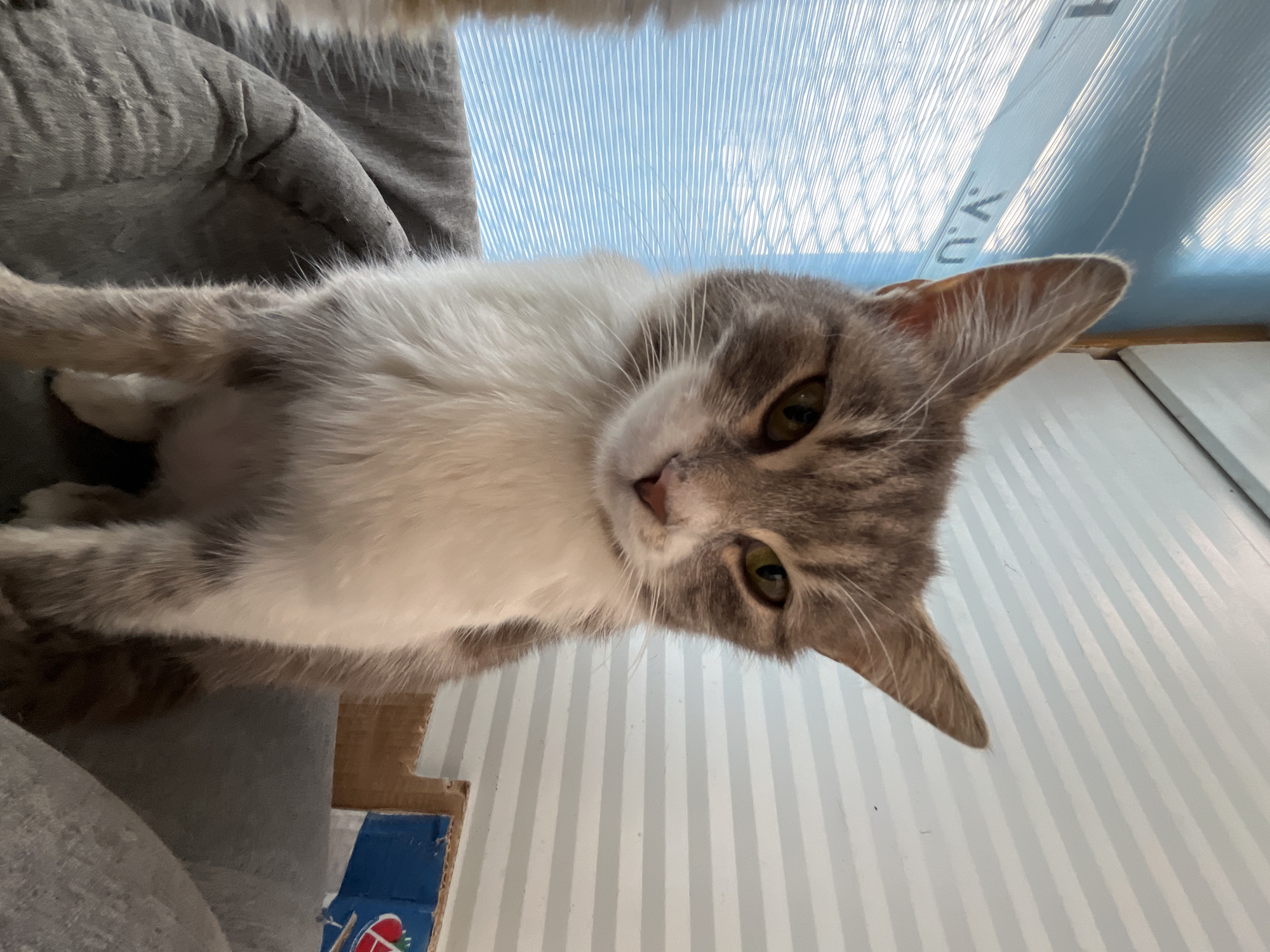 A grey and white cat is lying down and looking at the camera. The cat is lying on a grey cushion. Behind the cat is a white wall with light blue stripes. The image shows part of a cardboard box. The location in the city of Shumen, Bulgaria is unknown.