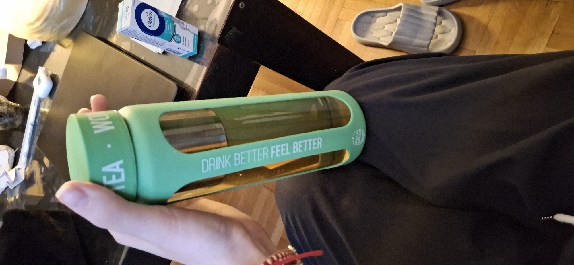 A person is holding a glass water bottle with a green silicone sleeve in their hand, while sitting on a surface draped with dark-colored cloth. The bottle has the words "DRINK BETTER FEEL BETTER" and "TEA - WOW" printed on it. To the left, on a dark-colored table, is a box of Otrivin nasal spray, a white bag, and a stylus. A pair of gray and white slippers are on the wooden floor. The location is not specified but given the prompt, it could be in the city of Sofia, Bulgaria.