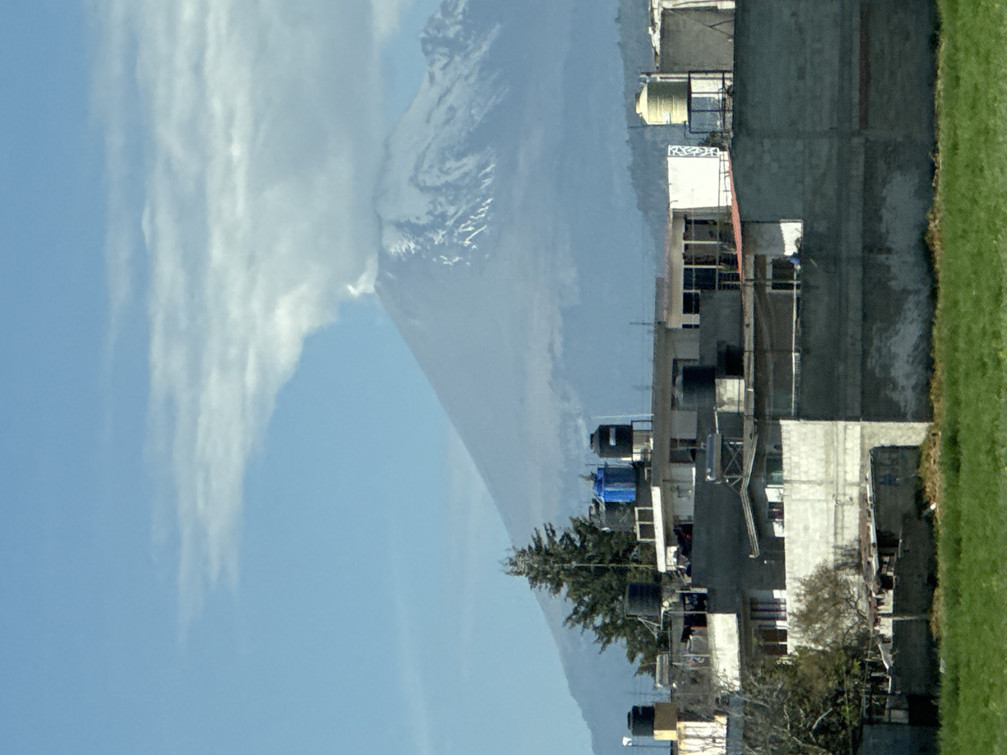 A view of San Rafael Tlanalapan, Mexico shows a gray concrete building with water tanks on its roof, with a grassy field next to it. In the distance, behind the building, is a mountain range with snow-capped peaks under a blue sky with clouds. A tree stands in front of the building.