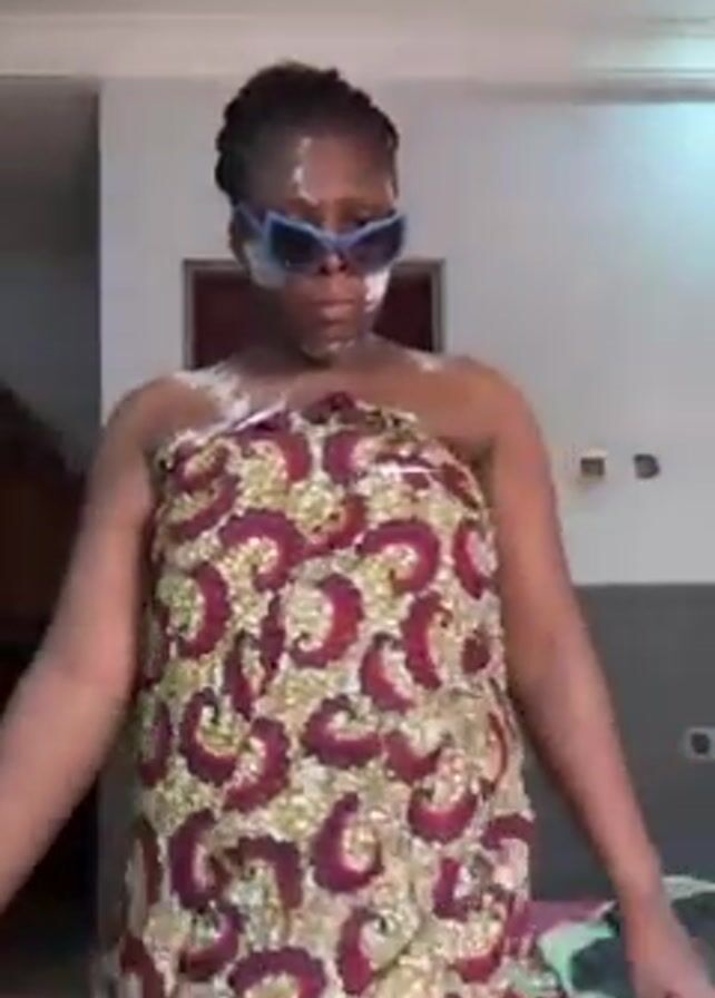 The video features a woman indoors. She is wearing a strapless, patterned wrap dress, large blue sunglasses, and has white powder on her face and chest. Her hair is in a bun. She gestures with her arms and then adjusts her glasses. The background includes a white wall, a doorway, and a bed.