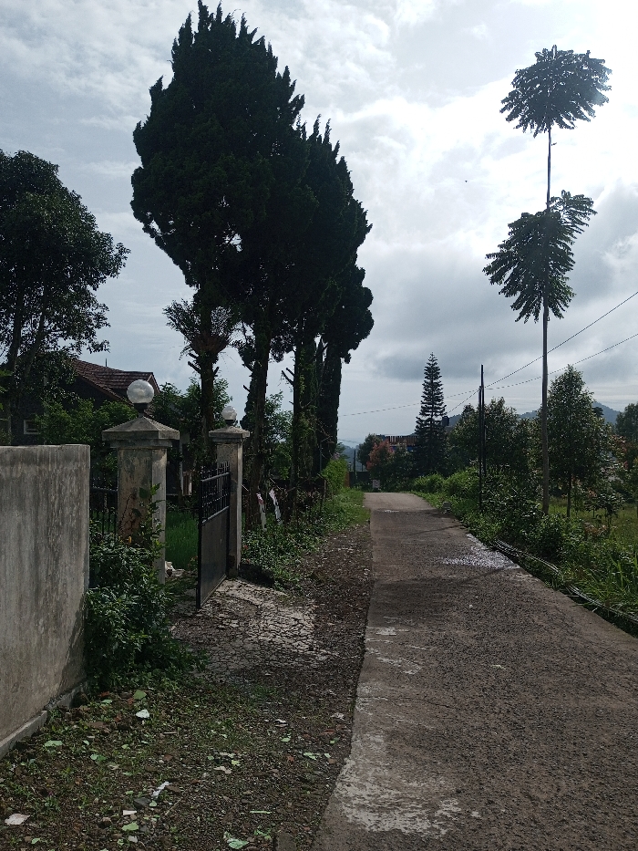 A concrete road stretches into the distance, flanked by lush greenery and tall, dark trees. A stone wall with an open metal gate stands to the left, hinting at a private property. The sky is overcast, casting a muted light. Peculiar trees with sparse foliage and tall trunks dot the landscape beyond the road, adding a unique visual element. In the background, a glimpse of a distant landscape suggests a hilly or mountainous region.