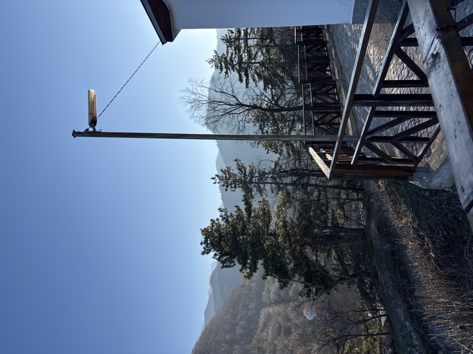 The image depicts an elevated outdoor scene in Kostenets, Bulgaria, under a clear blue sky. In the foreground, a dark brown wooden railing with a geometric crisscross design runs along the edge of a curved pathway. The pathway is paved with light-colored, possibly cobblestone, material. To the far right, a segment of a white building wall with a reddish-brown roof edge is visible. A tall, slender utility pole with a horizontal street light fixture is positioned centrally in the midground, its top slightly obscured by the fixture. A thin, dark wire extends downwards from the street light towards the building. Beyond the railing, the terrain slopes steeply downwards, covered in dry vegetation, bare tree branches, and darker soil patches. The background reveals a mountainous landscape, densely forested with coniferous and deciduous trees, some appearing bare, others evergreen. Multiple layers of mountains recede into the distance, with some distant peaks exhibiting lighter coloration, possibly snow. No individuals or animals are present.