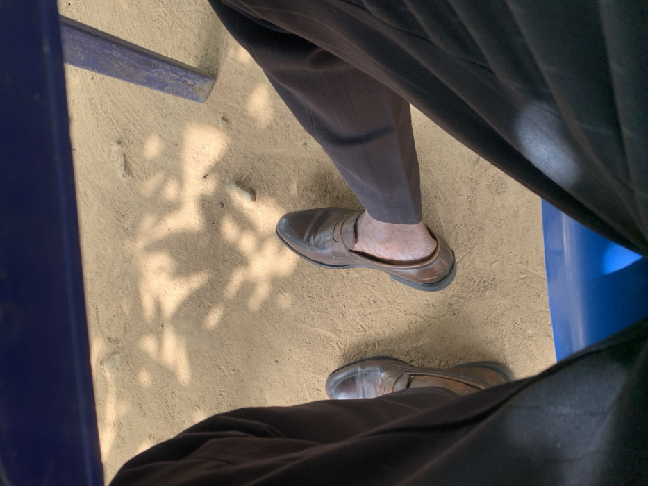 The image provides a close-up, downward-facing perspective of two human legs situated on light brown, unpaved ground in Assai Sabongida, Nigeria. The ground has a sandy or dusty texture and is illuminated by natural light, casting distinct, dappled shadows across its surface, indicative of overhead foliage. Both visible legs are clad in dark brown trousers. The foot on the left is fully encased in a brown leather loafer. The foot on the right features a similar brown leather loafer, but it is partially slipped off the foot, exposing the bare heel and lower ankle. A segment of a blue object, consistent with a chair or bench seat, is visible at the bottom of the frame, positioned between the legs. Additionally, a blue, possibly metallic, furniture leg is present in the upper right corner of the image. The scene appears static.