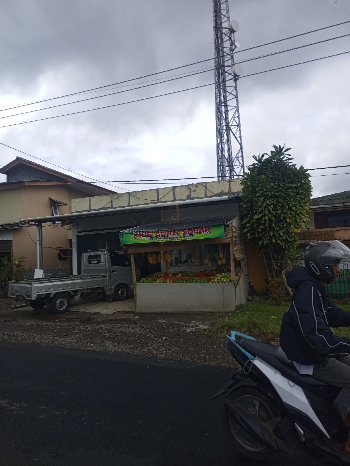 A roadside fruit stand, "KIOS BUAH SEGAR," displays bananas and green fruits. A gray pickup truck is parked beside it, near a two-story building. A tall communications tower rises in the background under a cloudy sky. A motorcyclist wearing a helmet and dark jacket is riding on the road in the foreground. The scene appears to be in a rural or semi-rural area.